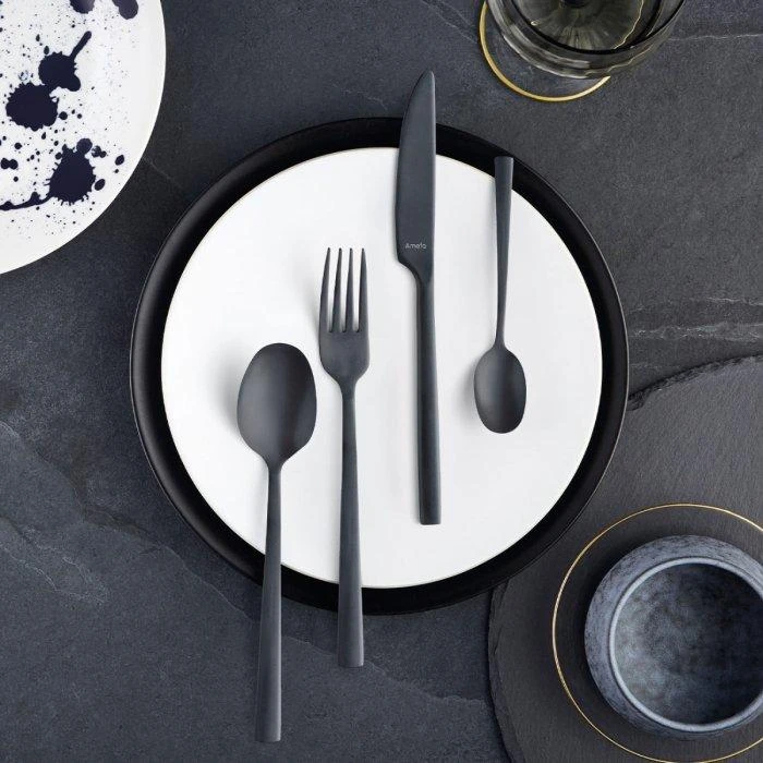 Setze ein Zeichen mit dem Amefa Manille All You Need 9035 Besteckset 42-teilig Ein robustes mattschwarzes Besteckset. Das Besteck Manille von Amefa hat mit seinen flachen Griffen einen eleganten und modernen Look. Hergestellt aus rostfreiem Stahl 18/0 mit einer dünnen PVD-Beschichtung (Physical Vapor Deposition) aus Titan
