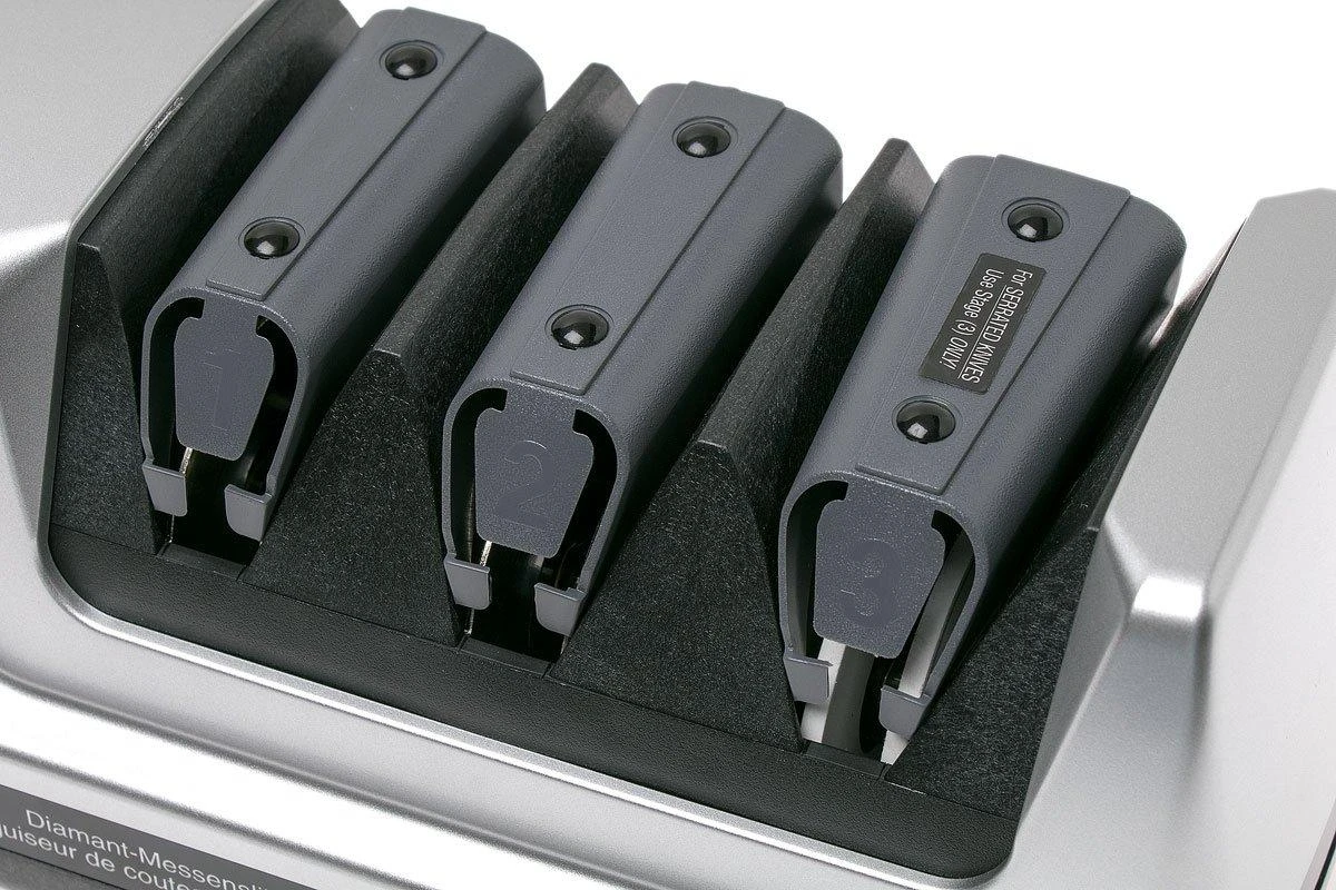 Die Maschine besteht aus mehreren Phasen. Die ersten beiden Phasen haben diamantbeschichteten Scheiben und die dritte Phase hat eine spezielle Polierscheibe. So erzielst Du in kurzer Zeit eine sehr scharfe Schneide bei sowohl normalen Messern wie auch bei Messern mit Wellenschliff. Gefederte Messerführungen sorgen automatisch für den richtigen Winkel.