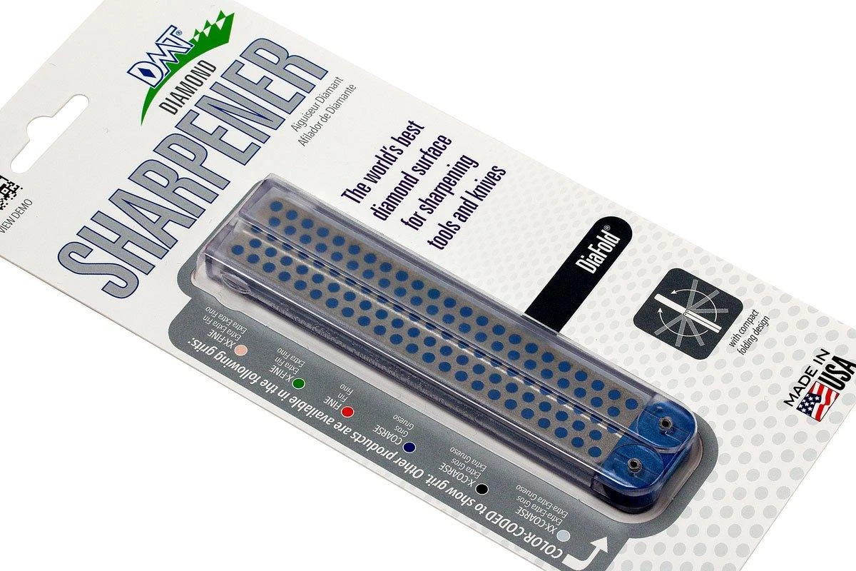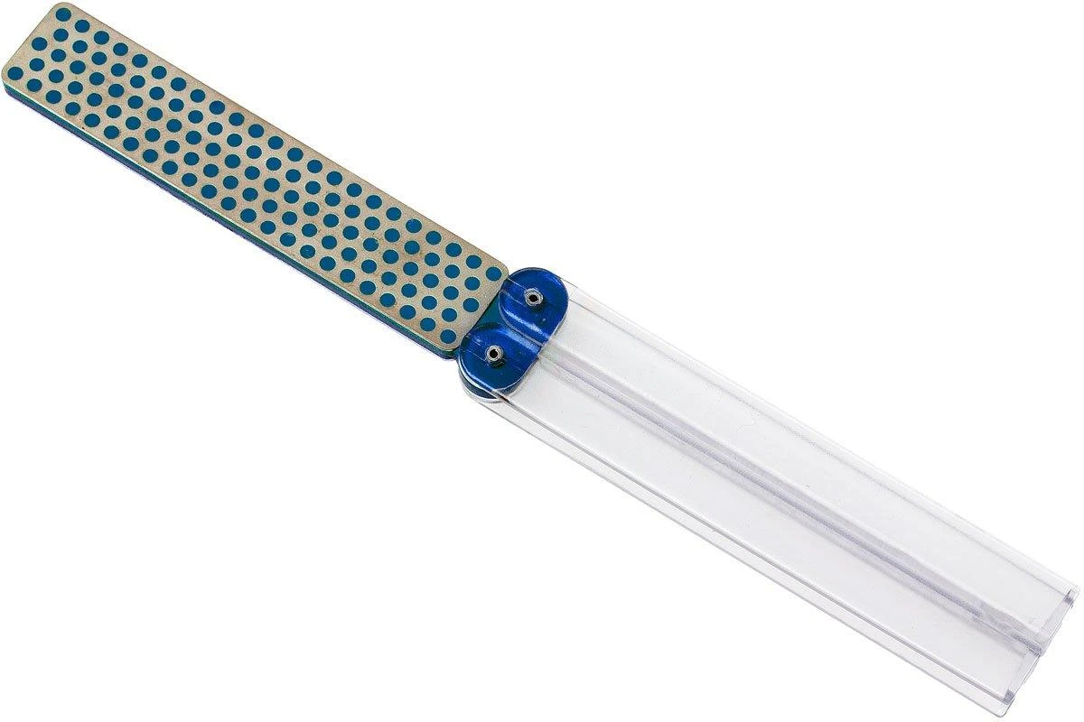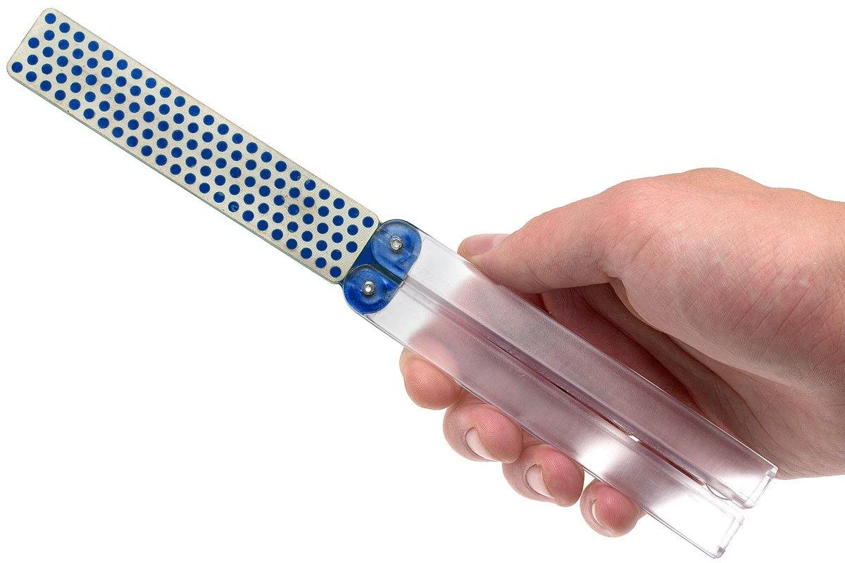 Ein Diafold-Schleifstein hat das Design eines Butterfly-Messers, bei dem der Griff um den Diamantschleifstein gelegt wird. So werden die Steine optimal geschützt. Sie sind auf einer Seite nutzbar. Die Farbe im bekannten DMT-Muster zeigt an, um welche Korngröße es sich handelt.
