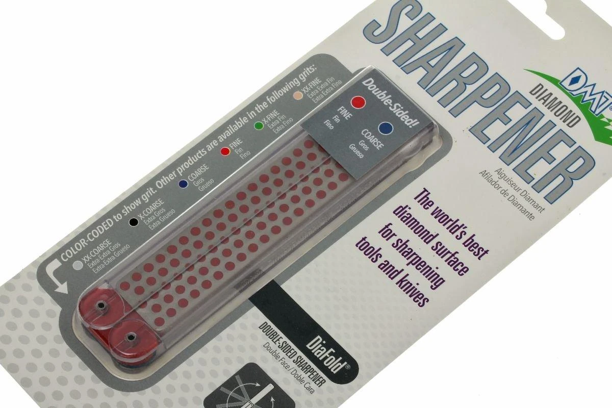 Ein Diafold Schleifstein hat das Design eines Schmetterlingsmessers, wobei der Griff an den Diamant-Schleifstein gefaltet wird. Somit wird der Stein optimal geschützt. Die Steine können zweiseitig verwendet werden, wobei jede Seite ihre eigene Körnungsgröße hat. Die Farbe in dem berühmten DMT Kreis-Muster zeigt, um welche Körnungsgröße es sich handelt.