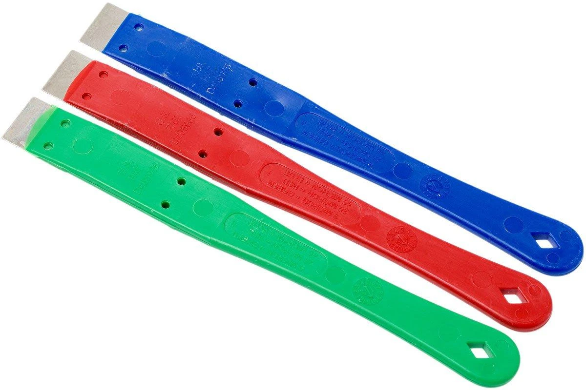 Dieses DMT DiaSharp Set besteht aus drei Diamant-Mini-Hones/Feilen. Die drei Feilen besitzen drei verschiedene Farben, die einer bestimmten Korngröße entsprechen: blau (grob), rot (fein) und grün (extra fein). Die Dia-Sharp Mini-Hones sind schmal und sehr praktisch und können auch schwer zugängliche Stellen gut erreichen. Aber auch zum Schleifen kleinerer Teile sind die Feilen perfekt. Dank der ergonomisch geformten Griffe ist es sehr angenehm damit zu schleifen.