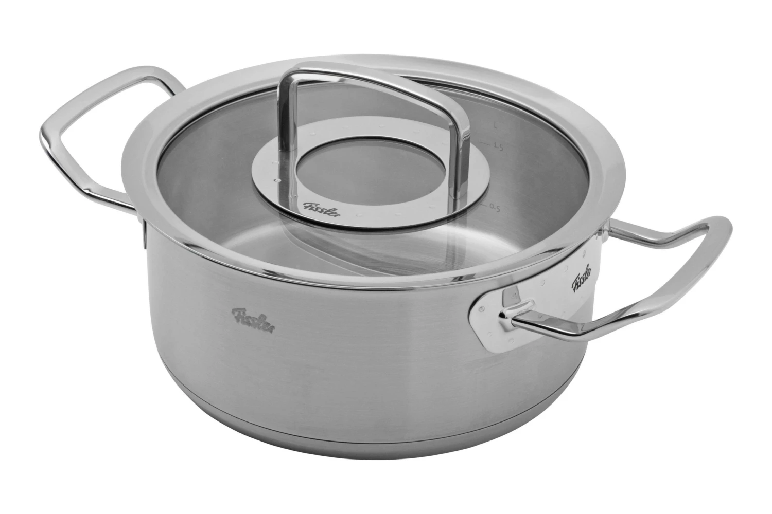 Dieser Fissler Original Profi Collection Kochtopf hat einen Durchmesser von 20 cm und ein Fassungsvermögen von 2,6 Litern. An der Innenseite des Topfes befindet sich eine Maßangabe zum Fassungsvermögen, die auf bis zu 1,5 Litern reicht. Der Topf wird mit einem Deckel aus Glas und Metall geliefert.