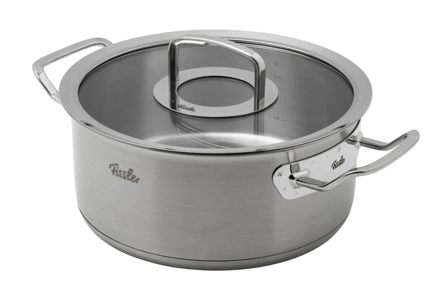 Dieser Fissler Original Profi Collection Kochtopf hat einen Durchmesser von 24 cm und ein Fassungsvermögen von 4,6 Litern. An der Innenseite des Topfes befindet sich eine Maßangabe zum Fassungsvermögen, die auf bis zu 3 Liter reicht. Der Topf wird mit einem Deckel aus Glas und Metall geliefert.