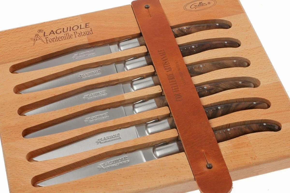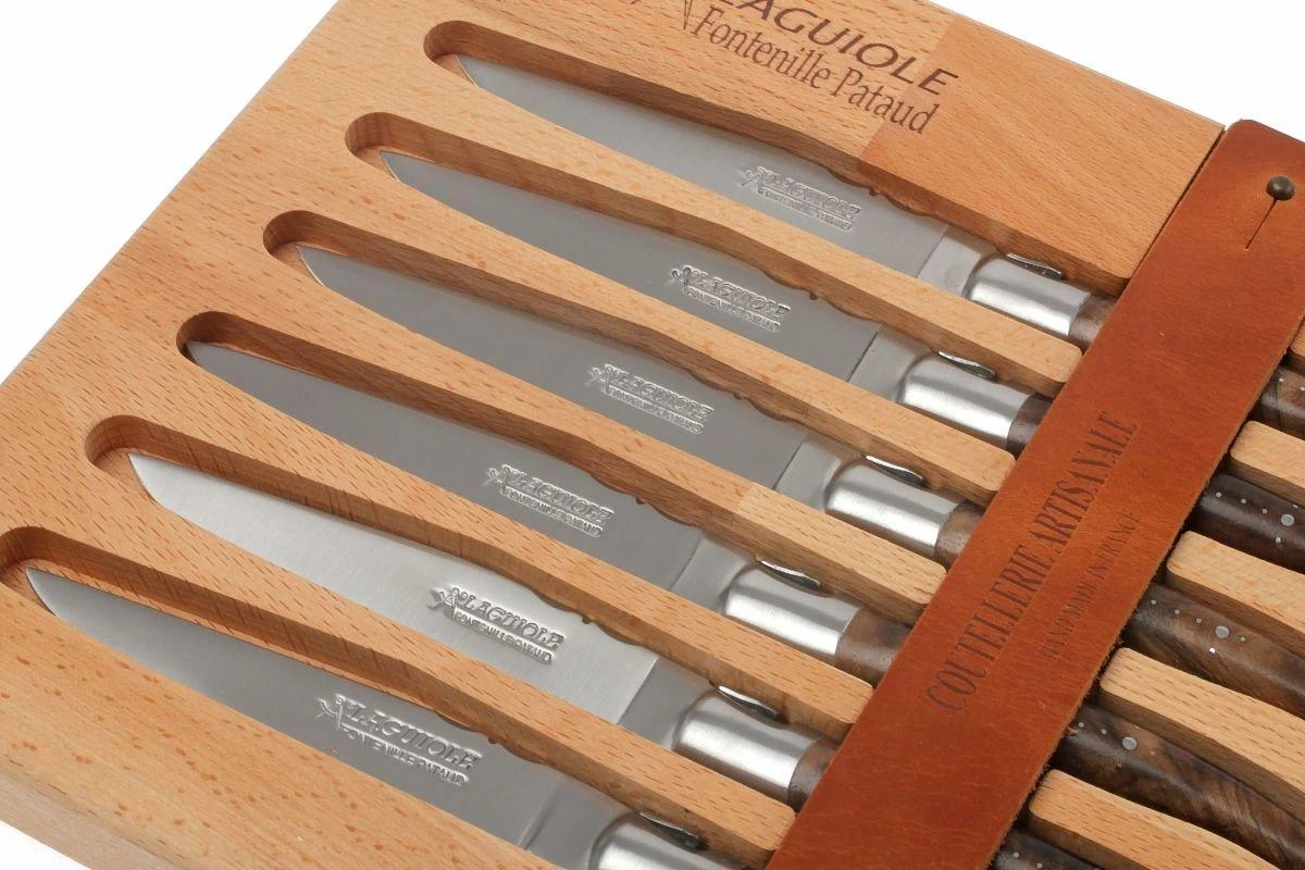 Dieses Fontenille Pataud Steakmesserset besteht aus sechs einzigartigen, wunderschönen Laguiole Tafelmessern. Jedes Messer wird in Thiers – der französischen Messerhauptstadt – handgefertigt und hat einen Griff aus luxuriösem Walnussholz. Mit diesen Steakmessern im Haus wirst Du jeden Tag Gäste zum Essen einladen wollen!
