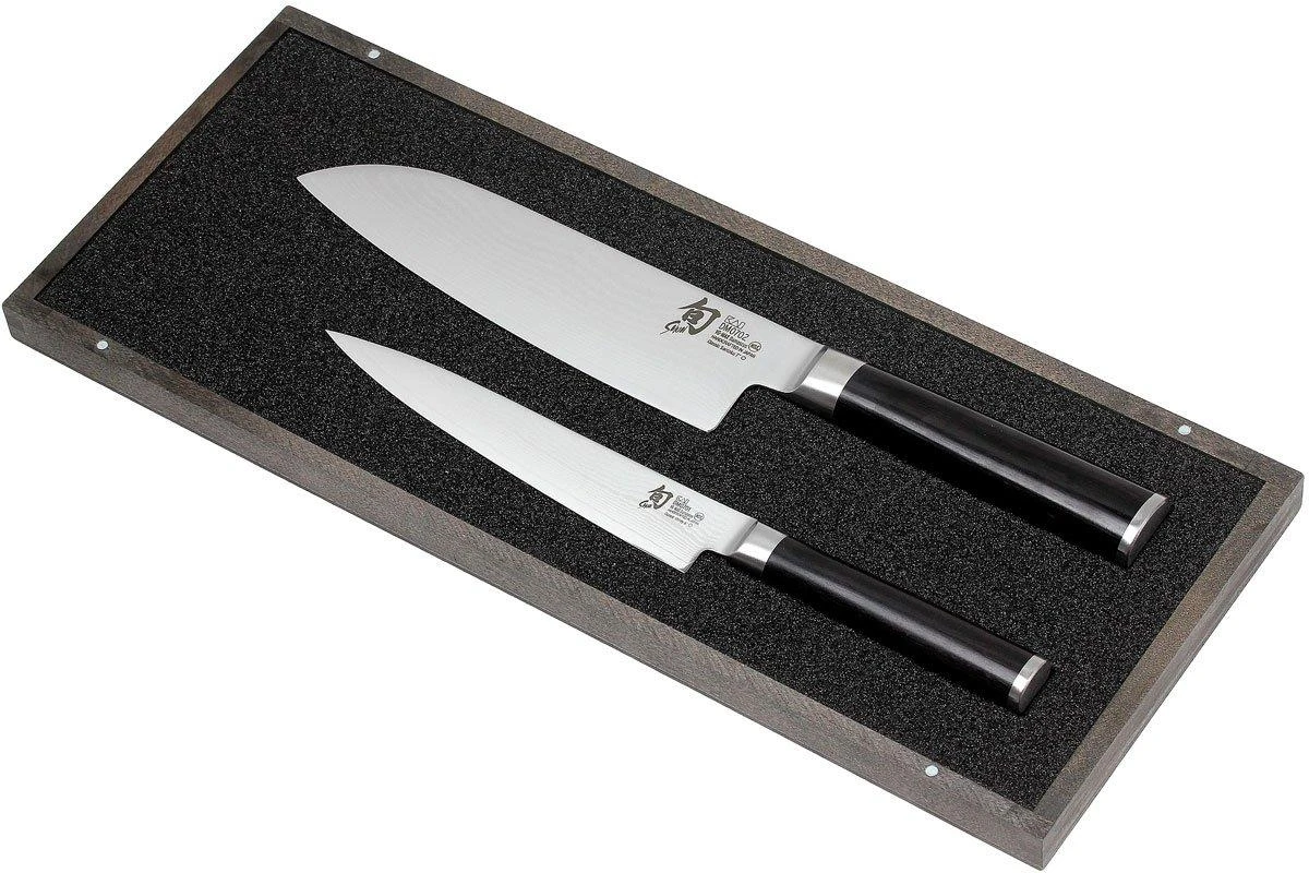 Dieses Kai Shun Messerset beinhaltet zwei Kai Shun Classic Messer. Die Kai Shun Classic Messer verfügen über eine 32-lagige, rostfreie Damaststahlklinge. Damaststahl ist ein Stahl, der aus mehreren übereinander geschmiedeten Stahlschichten besteht. Das verleiht diesem Stahl eine hohe Reinheit und Härte. Der VG-MAX Kern trägt zu den unübertroffenen Schneideigenschaften bei. Die Messer sind auf 61 ±1 HRC gehärtet, was sehr hart ist. So bleiben diese Messer lange scharf. Die Griffe sind aus laminiertem Pakkaholz gefertigt und haben eine asymmetrische Form. Da das Set aus einem Universal- und einem Santokumesser besteht, hast Du alles, was Du brauchst, um ein neues kulinarisches Abenteuer zu starten. Um dieses Abenteuer noch runder zu machen, ist auch ein Set mit Schneidebrett erhältlich. Die Messer sind nicht nur ein absoluter Augenschmaus, es ist auch noch eine Freude, mit ihnen zu arbeiten!