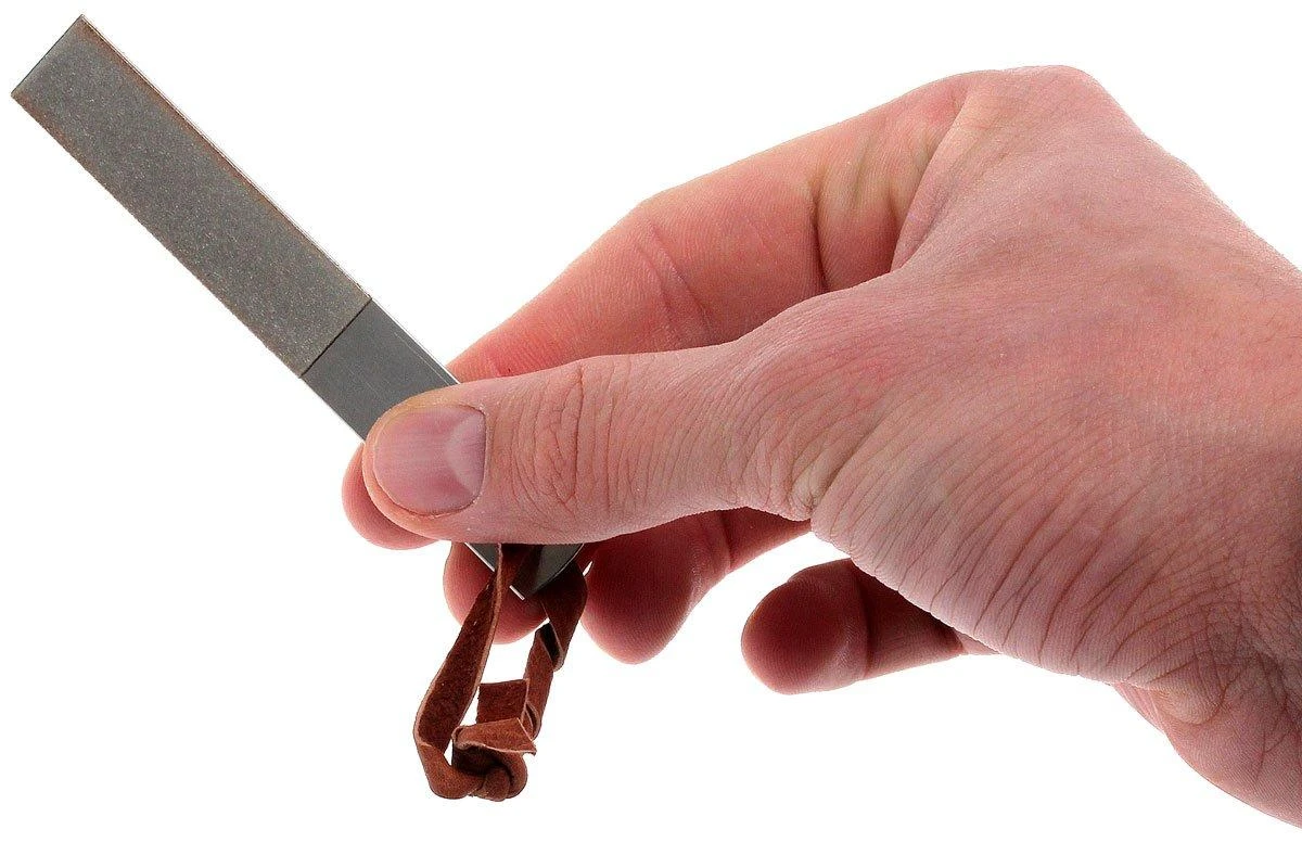 Dieser Karesuando Diamantschärfer ist ideal, um Deine Messer auch unterwegs schärfen zu können. Der Stein besitzt eine grobe und eine feine Kante. Die Lederscheide mit Lederschnur schützt den schleifstein unterwegs.