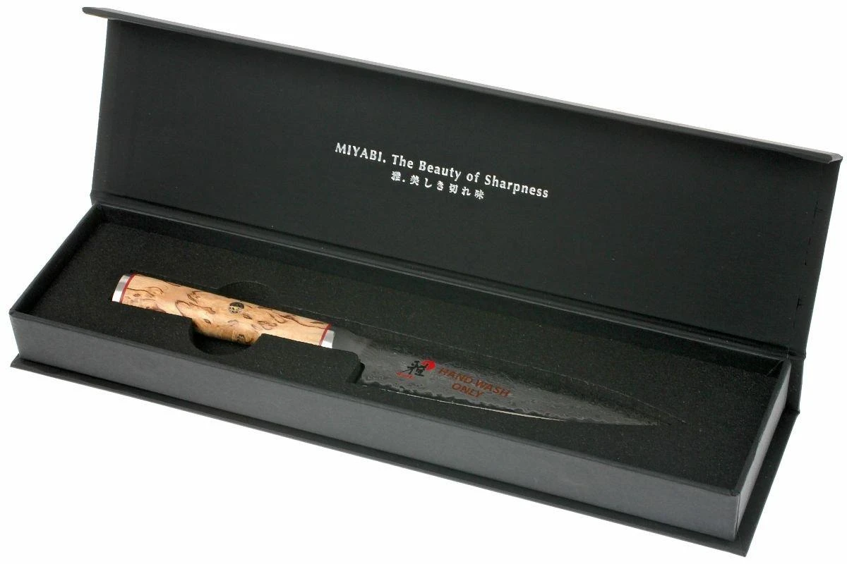 Das Miyabi 5000MCD-shotoh 13 cm kommt aus der Zwilling J.A. Henckels Fabrik in Seki, Japan. Besonders auffällig sind der ergonomisch geformte D-Griff aus Masur-Birkenholz und das schöne Damaststahlmuster auf der Klinge.