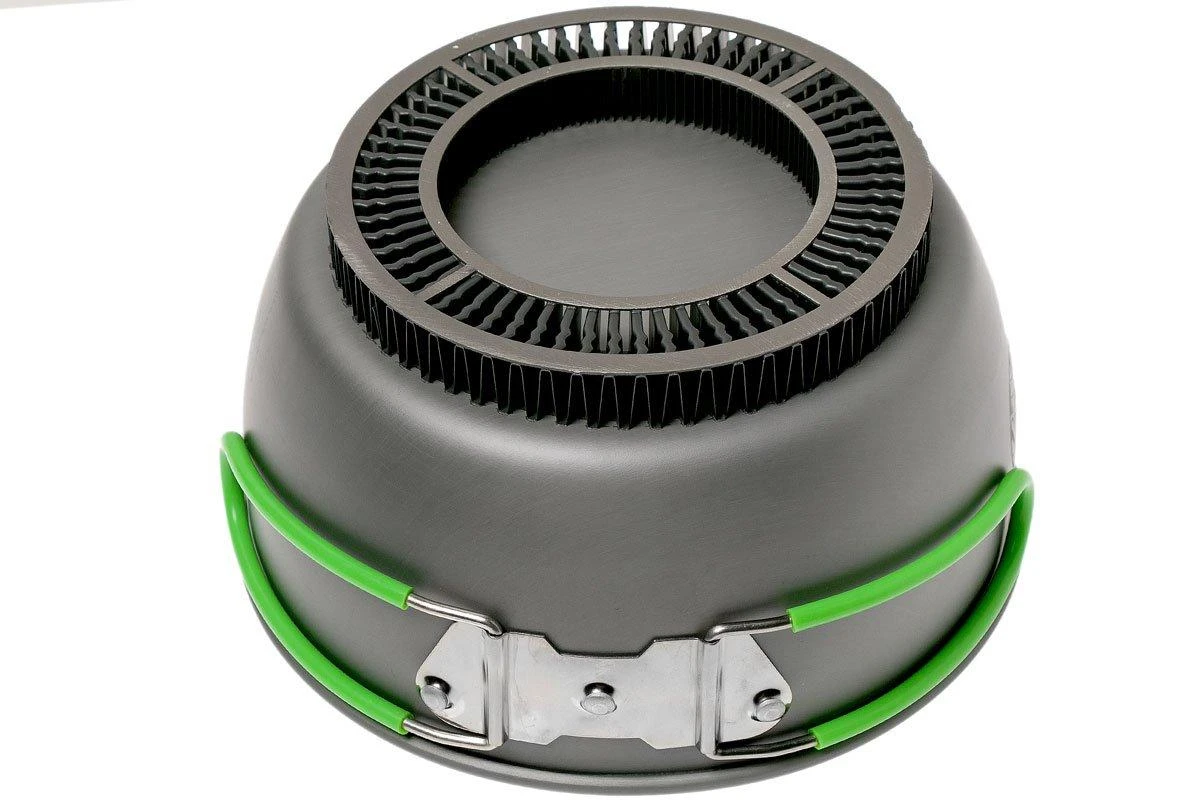 Der Optimus Terra Xpress HE Kochtopf ist ein großer und leichter Topf für den Außenbereich. Sein Fassungsvermögen von 1,75 l reicht aus, um für eine größere Gruppe beim Wandern oder Zelten zu kochen. Am Boden der Pfanne befindet sich ein praktischer Heatsink, der dafür sorgt, dass die Flamme eines Campinggasbrenners auf dem dünnen Boden gut verteilt wird. Dadurch wird die Pfanne gleichmäßiger erhitzt und man hat weniger Chancen auf einen Brandfleck in der Mitte des Topfes.