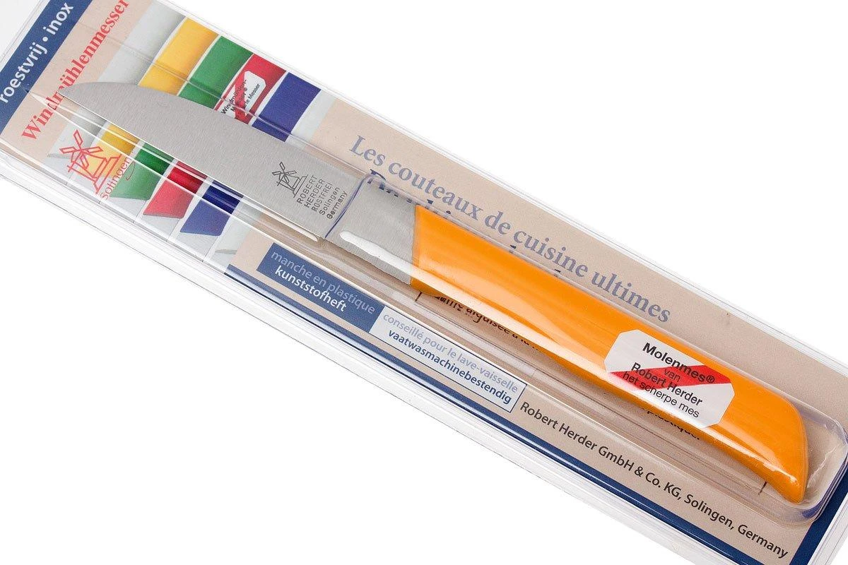 Das Robert Herder Straight Classic 1966 gelbe Schälmesser ist angelehnt an die berühmten Mühlenmesser von Robert Herder. Dieses Messer ist bestens dafür geeignet, um Obst und Gemüse zu schälen. Aber natürlich kannst Du damit auch Fisch und Fleisch schneiden. Der Griff aus Polypropylen-Kunststoff bietet einen hervorragenden Halt. Die Klinge ist aus rostfreiem Stahl gefertigt und nach dem Prinzip des traditionellen „Solinger Dünnschliffs“ von Hand geschliffen. Das Ergebnis ist ein sehr scharfes Messer.