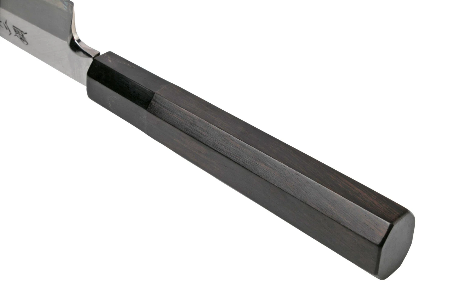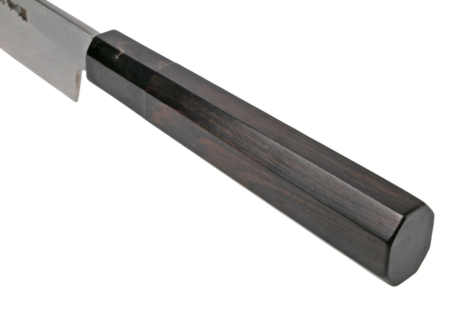 Das Sakai Takayuki Blue 2 Steel Japanese Style 01204 Yanagiba ist ein einseitig geschliffenes Küchenmesser zum Schneiden von Fleisch-, Fisch- oder Gemüsescheiben. Dank der 27 cm langen Klinge kannst Du für jede Scheibe eine einzige lange Schneidbewegung ausführen. So kannst Du Fleisch, Fisch oder Gemüse in hauchdünne Scheiben schneiden. Perfekt für Sushi oder Sashimi!