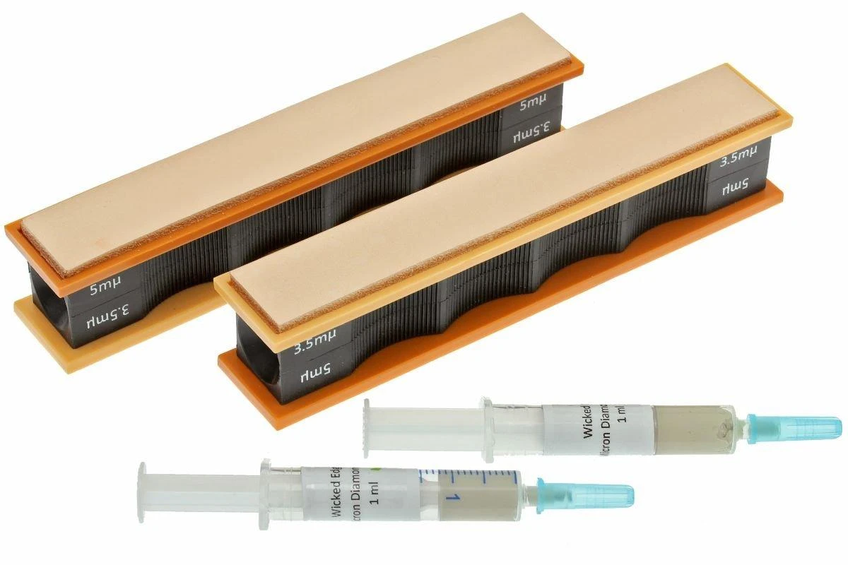 Die Wicked Edge Lederstrops, 5 und 3,5 Mikron sind zwei Lederstifte für die Wicked Edge Schleifsysteme. Die Schleifsteine bestehen aus einer Kunststoffbasis, an der zwei Lederstreifen befestigt sind. Dieses Set enthält zwei verschiedene Arten von Schleifpasten mit 5 und 3,5 Mikron.