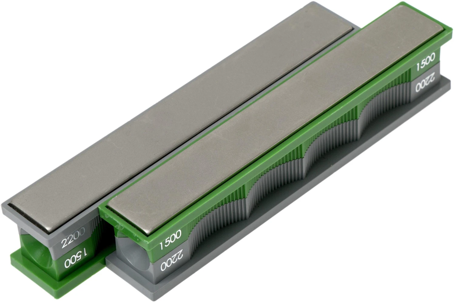 Das Wicked Edge Diamond Stones Pack 1500/2200 besteht aus zwei Schleifsteinen für die Wicked Edge Schleifsysteme. Die Schleifsteine haben eine Kunststoffbasis, an der Diamantschleifsteine befestigt sind. Es gibt zwei verschiedene Körnungen auf den Schleifsteinen. Die grüne Seite hat eine Körnung von 1500, die graue Seite eine Körnung von 2200.
