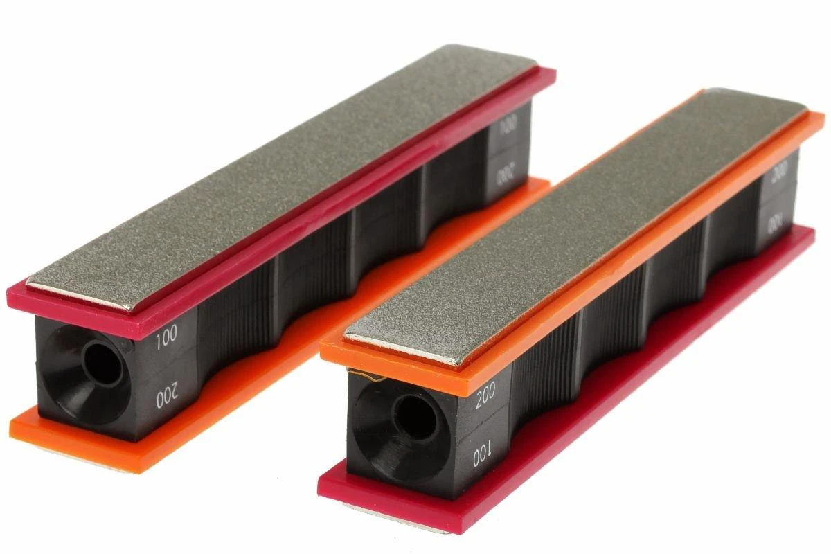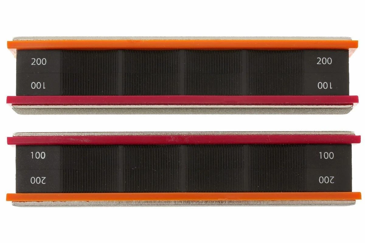 Die Wicked Edge Diamantschleifsteine, grob 100/200 sind zwei Schleifsteine für die Wicked Edge Schleifsysteme. Die Schleifsteine haben eine Kunststoffbasis, auf der Diamantschleifsteine befestigt sind. Die Schleifsteine haben zwei verschiedene Korngrößen: die rote Seite hat die Korngröße 100 und die orangefarbene Seite die Korngröße 200.