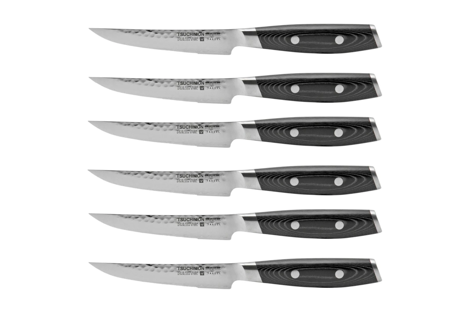 Das Yaxell Tsuchimon 6-teilige Steakmesserset besteht aus sechs stilvollen japanischen Steakmessern mit einer gehämmerten Klinge und einem Messerblock aus Buchenholz. Die Messer haben einen sehr kleinen Wellenschliff, damit sie lange scharf bleiben und Fleischstücke mühelos durchschneiden. Schön zum Verschenken und auch, um es zu bekommen!