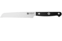 Lerne das Zwilling Gourmet Universalmesser mit Wellenschliff 13 cm kennen. Der Name ist Programm, denn es handelt sich um ein echtes Multitalent in der Küche. Das Messer verfügt über die von Zwilling neu entwickelte Wellenschliffstruktur: einzelne Wellenschliffe wechseln sich mit einem spitzeren Schliff ab. Vor allem beim Schneiden von Produkten mit einer härteren Kruste wirst Du den Unterschied bemerken. Das ist wenn Du Brot und harte Brote schneiden möchtest. Aber auch Produkte wie Tomaten, Käse und Wurst können damit mühelos geschnitten werden. Das Messer ist Teil der Gourmet-Serie von Zwilling. Eine umfassende Serie von Küchenmessern im klassischen Drei-Nieten-Design.